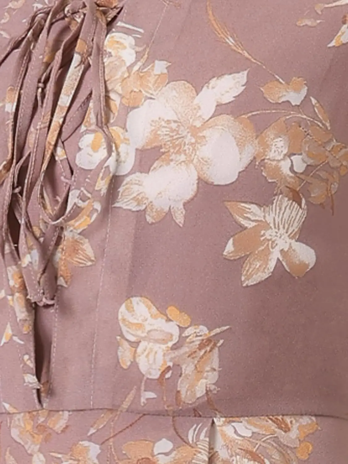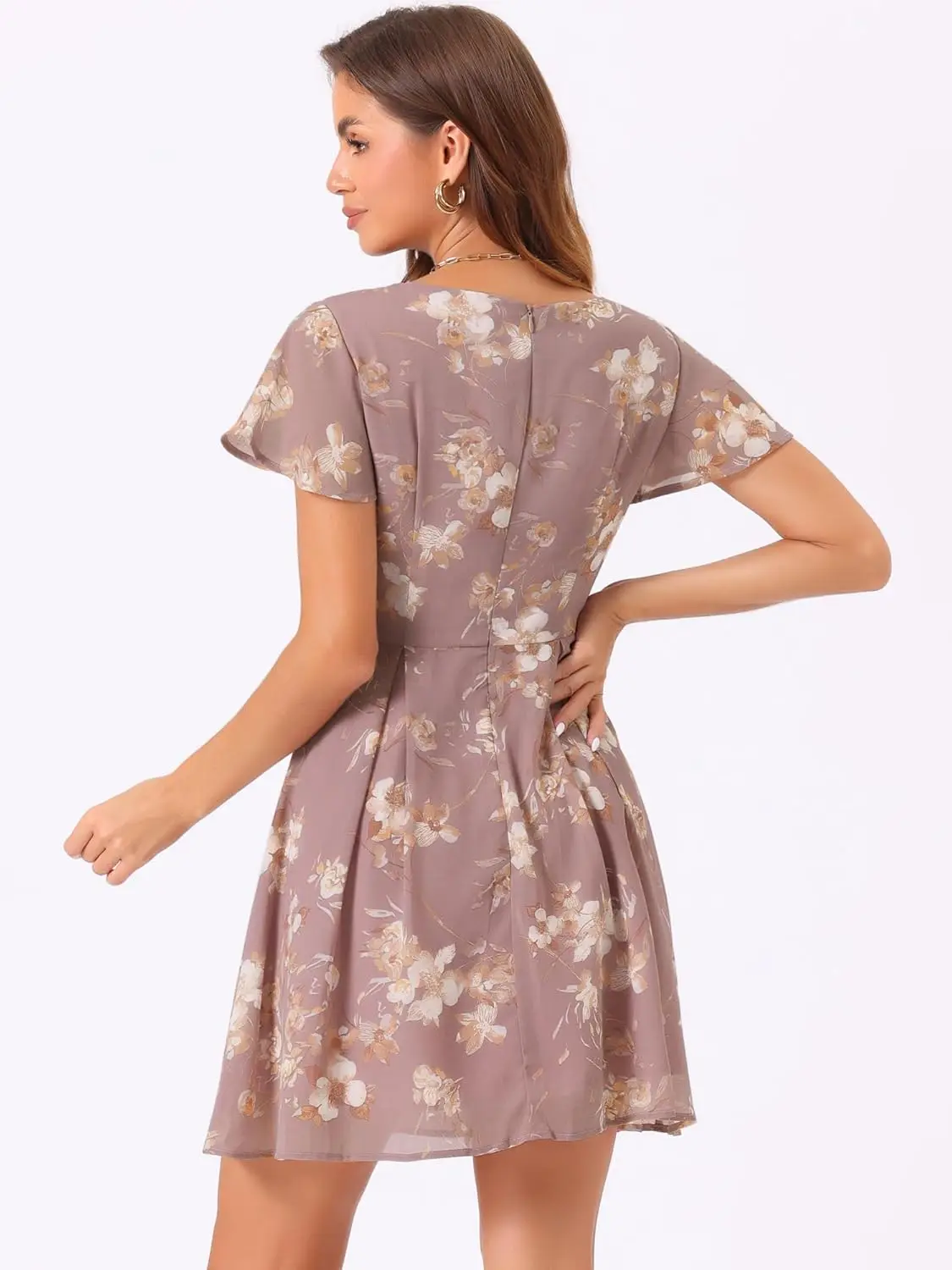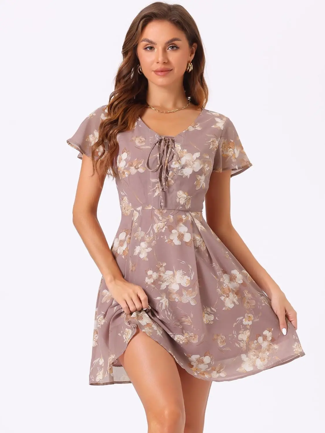 High Street Women's Floral Printed Chiffon A-line Dress Washable Spring Summer Party Flare Short Sleeve Lace-up V Neck Natural